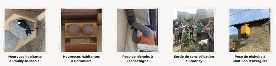 Ce qui fait un total, entre 2021 à 2024, de 214 nids artificiels installés sur 15 villages partenaires, grâce aux mobilisations de tous sur le territoire. - Prise de contact fin 2023 avec les élus du Bois d’Oingt, Chessy, Marcy, St Cyr-le-Châtoux, Sainte Paule et Vaux en Beaujolais pour discuter de ce qui pourrait être mise en place.