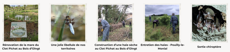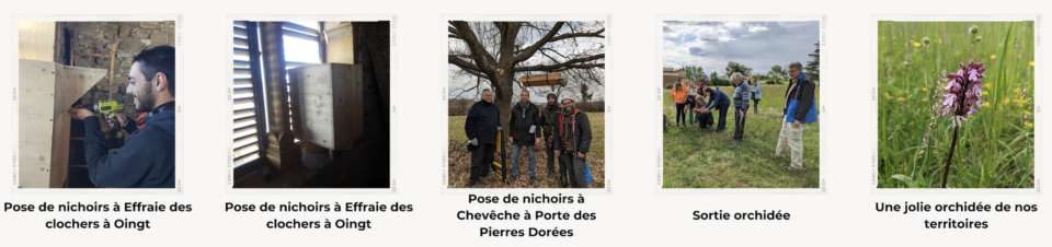 - Engagement auprès d’autres espèces : avec l’appui à la LPO, recherche de bâtiments agricoles favorables à la pose de nichoirs : projets retenus à Bagnols (chouette Effraie), Theizé (chouette Effraie / chauves souris et moineaux), Châtillon (chouette Effraie) et Pouilly le monial (chauves souris et moineaux).